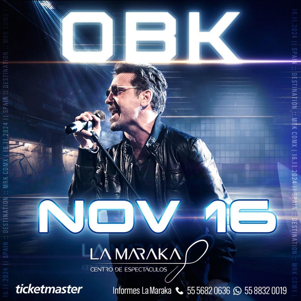 OBK, una de las bandas de pop electrónico más destacadas de España regresa a México para ofrecer un gran recital el Sábado 16 de Noviembre de 2024 en el Centro de Espectáculos La Maraka, quienes tras haber cumplido ya más de 3 décadas de trayectoria exitosa, 11 discos y millones de copias vendidas de sus discos, han decidido que aún quedan historias que contar. Los boletos están a la venta en el Sistema Ticketmaster y en taquillas del inmueble.